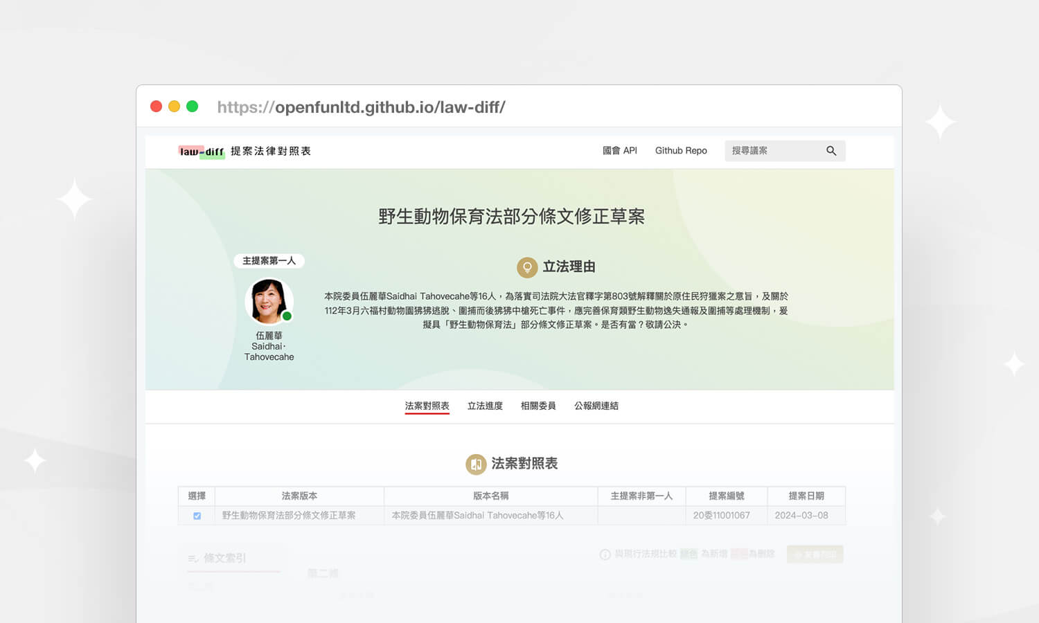 我們透過研究發現,即使是倡議團體、媒體記者、立委助理、事實查核團體等經常查詢立法院資料的專業工作者,在檢索法案資料時,依舊需要耗費大量時間,跨越多個網站與開啟一長串的分頁,或是埋首在數百頁的文件中才能找到所需資訊。