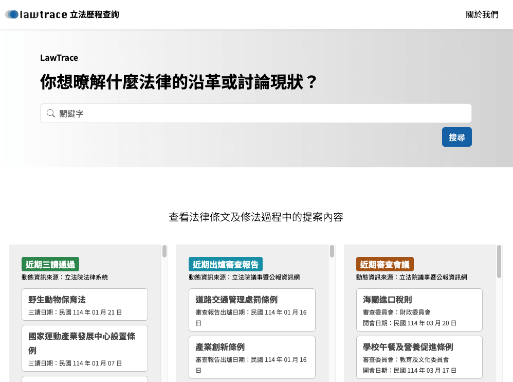 現在,這份深耕十年的技術底蘊,轉化為解決公共問題的實體產品。歐噴開發了 OpenBudget 政府預算查詢,將繁雜難懂的預算書轉化為視覺化、可比較的結構化資料;透過 LawTrace 立法歷程查詢,將分散在各機關的法案資訊一鍵彙整,大幅降低公眾參與立法的門檻;並推出 立法院國會頻道 AI 即時轉換逐字稿,讓國會討論能以最快的速度轉化為可搜尋的文字紀錄。